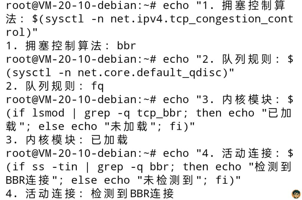 echo "1. 拥塞控制算法: $(sysctl -n net.ipv4.tcp_congestion_control)"echo "2. 队列规则: $(sysctl -n net.core.default_qdisc)"echo "3. 内核模块: $(if lsmod | grep -q t